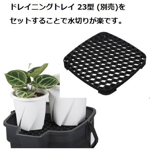 ●狙った場所にピンポイントで水を注ぐことができる●内側には、液肥・薬剤の希釈に便利な「目盛」付き●注ぎ口付なので、鉢花などの根本を狙って水やりするのにも便利●規格:10型、容量:10L、内寸上部サイズ(mm):278 × 240 × H225、内寸下部サイズ(mm):205 × 205●ドレイニングトレイ23型(別売)をセットすることで、鉢植え植物への水やりの際に水切りとしてお使いいただけます。