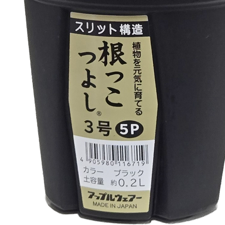 メーカー:アップルウェアー 根の生育環境を整え、植物を強く元気に育てるスリット鉢! アップルウェアー 根っこつよし 3号 ブラック 5個組 対象 植物 特長 ●通気性や排水性を良くして、根の生育環境を整えるスリット構造です。 ●通気性を良くすることで、根のサークリングを軽減し、植物の発根が促進され元気に育ちます。 ●鉢底と地面の間に隙間ができる足つき構造で、排水性が良く根腐れを軽減します。 数量 1個 仕様 土容量:約0.2L サイズ(約) 直径90×高さ138mm 材質 ポリプロピレン